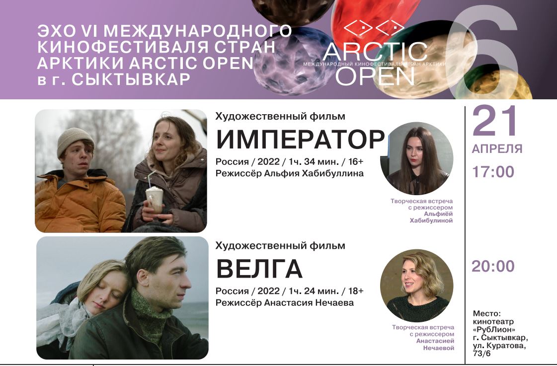 "Международный кинофестиваль Arctic open второй год открывает весенние кинопоказы на территории Республики Коми, для нас это прекрасная возможность не только насладиться отличными работами, но и пообщаться с творцами" - отмечает директор КомиКино Мария Вахнина.