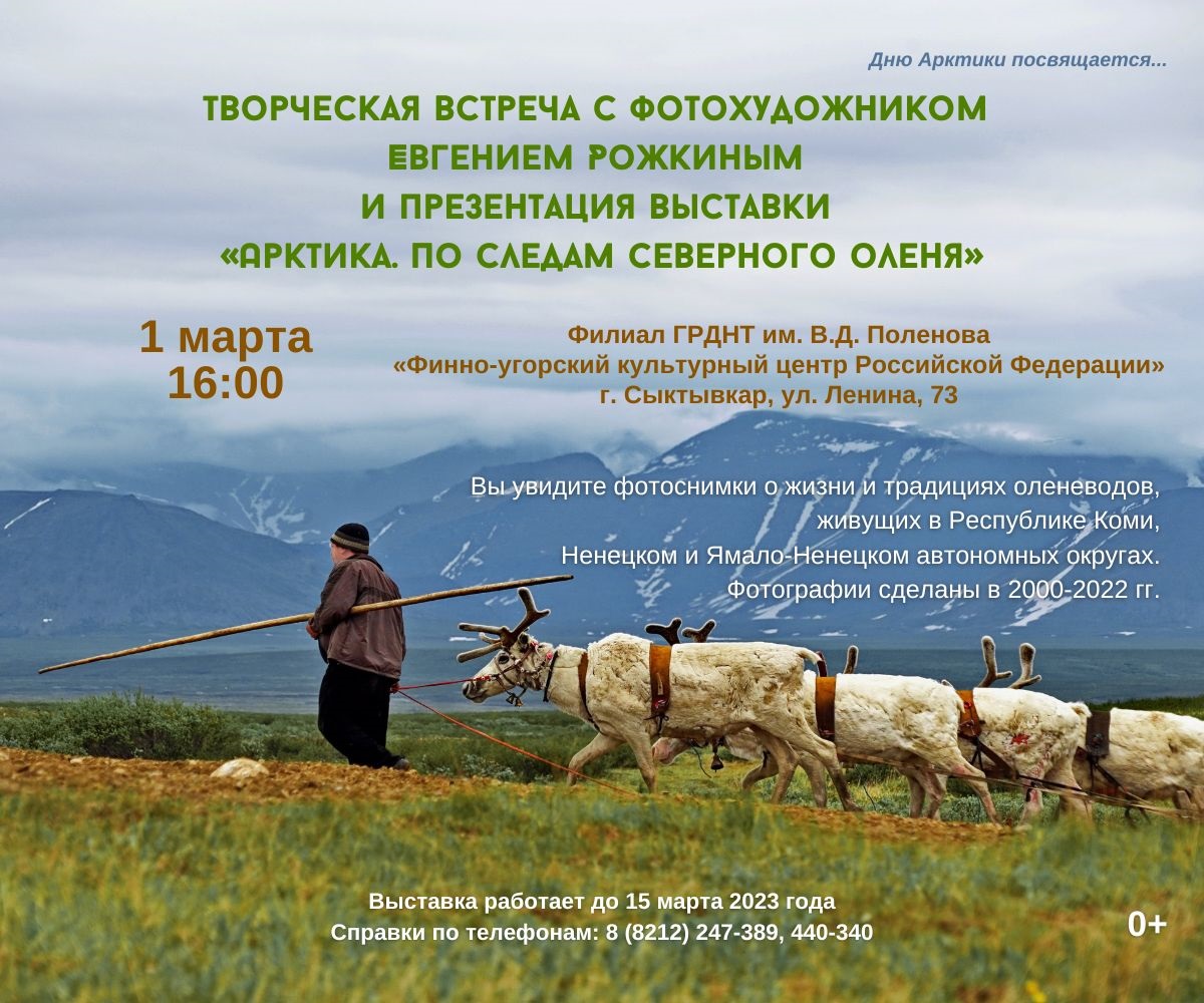 1 марта состоится творческая встреча с фотохудожником Евгением Рожкиным и презентация его персональной выставки "Арктика. По следам северного оленя" (0+). Мероприятие посвящено Дню Арктики, сообщает информационный центр "Финноугория".