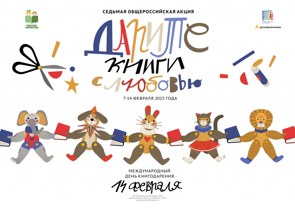 С 7 по 14 февраля 2023 года Ассоциация деятелей культуры, искусства и просвещения по приобщению детей к чтению "Растим читателя" при поддержке Российской государственной детской библиотеки проведёт Седьмую общероссийскую акцию "Дарите книги с любовью" .