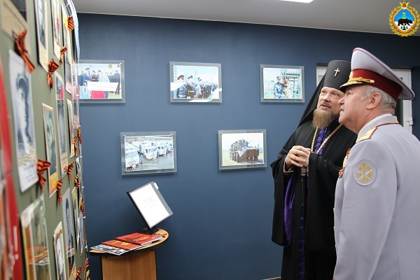 Так, в фойе Управления установлен тематический стенд, на котором размещены портреты фронтовиков – родственников сотрудников. Стену памяти дополняют лампады, выставленные в форме числа 78, каска, плащ-палатка и фляжка.