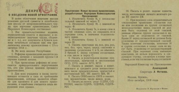 23 декабря 1917 г. (5 января 1918 г.) был опубликован и вступил в силу декрет Народного комиссариата просвещения РСФСР за подписью А. В. Луначарского «О введении нового правописания». Всем правительственным и государственным изданиям предписывалось с 1 (14) января 1918 г. «печататься согласно новому правописанию», а школам внести соответствующие изменения в обучение грамоте.