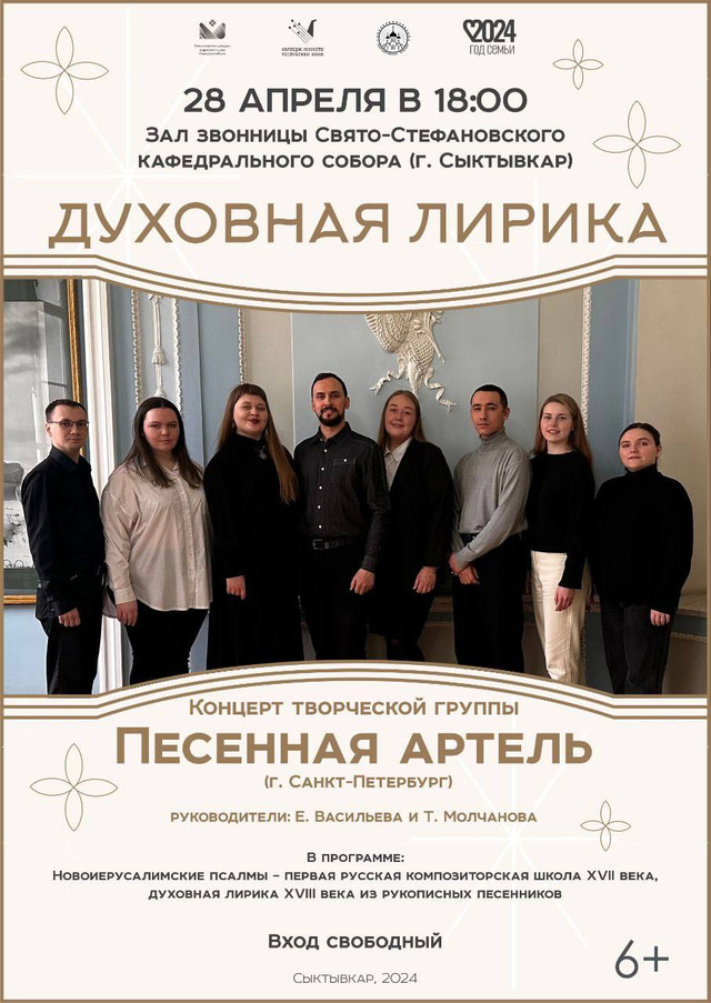 Приглашаем вас на концерт «Духовная лирика» творческой группы «Песенная артель»! Этот вечер будет наполнен музыкой и творческой атмосферой.