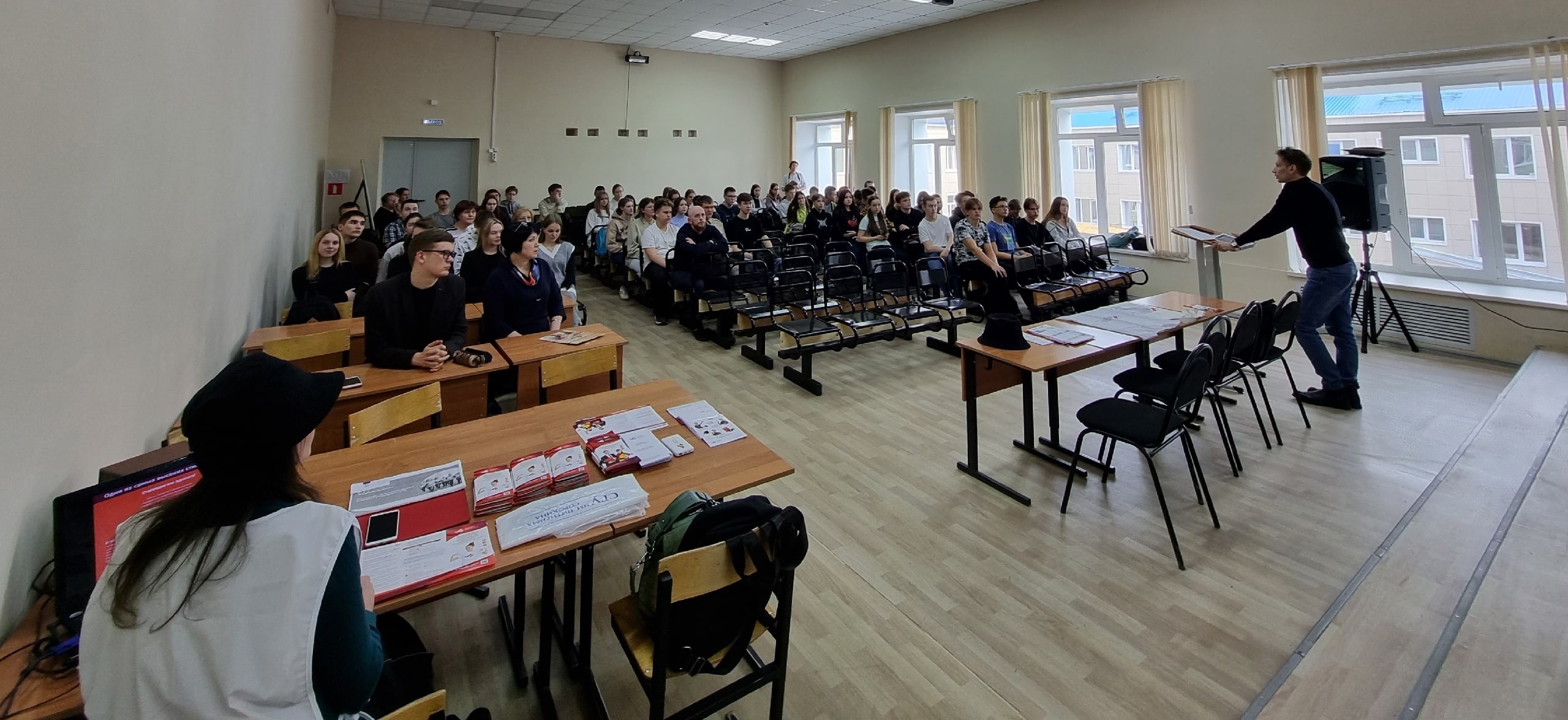 Университет представили преподаватели Института педагогики и психологии Жанна Кабатова и Анна Плехова , Институт социальных технологий – Андрей Фокин . Педагоги рассказали о направлениях подготовки и профилях, в том числе новых, для выпускников 11 класса, озвучили правила приема, преимущества обучения в СГУ имени Питирима Сорокина. Уделили внимание инфраструктуре Университета. Внимание ребят привлек рассказ о внеурочной деятельности студентов. Уделили внимание магистерским программам.