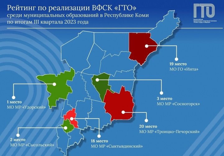 Не все результаты оказались положительными. Наименее эффективной, по совокупности оцениваемых критериев работы, стали МО МР Прилузский, который утратил 13 позиций Рейтинга ГТО оказавшись на 13 месте, МО МР Койгородский с 7 позиции «спустился» на 14 место в Рейтинге ГТО и МО МР Троицко-Печорский показал отрицательный рост, занявший 20 позицию Рейтинга.