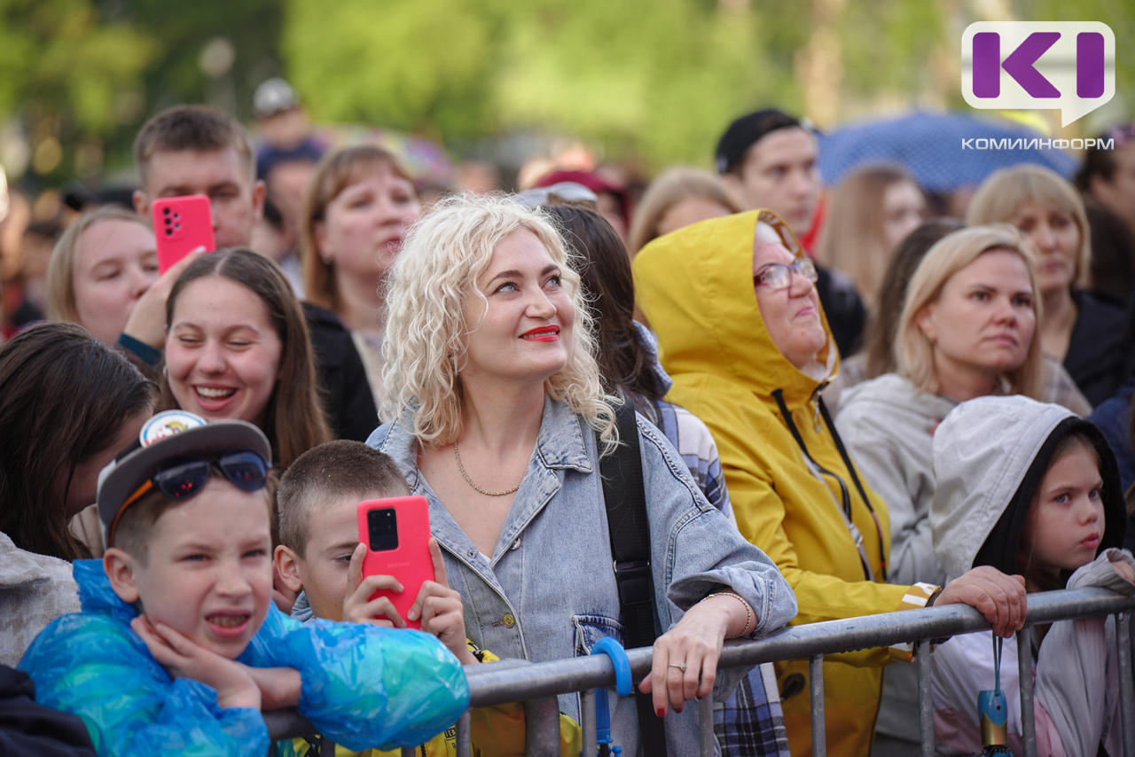Чтобы согреться и обсохнуть, молодежь старалась двигаться, подпевала и пританцовывала у сцены, поддерживая исполнителей, музыкантов и танцевальные коллективы Республики Коми.