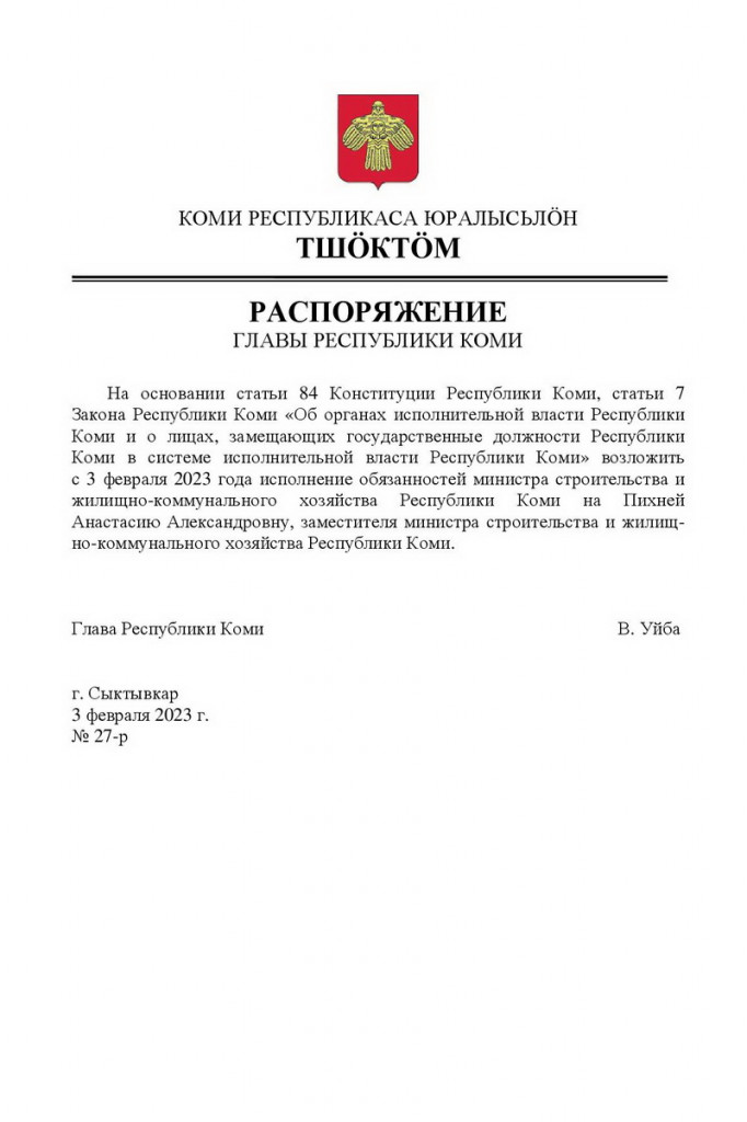 На основании статьи 84 Конституции Республики Коми, статьи 7 Закона Республики Коми «Об органах исполнительной власти Республики Коми и о лицах, замещающих государственные должности Республики Коми в системе исполнительной власти Республики Коми» возложить с 3 февраля 2023 года исполнение обязанностей министра строительства и жилищно-коммунального хозяйства Республики Коми на Пихней Анастасию Александровну, заместителя министра строительства и жилищно-коммунального хозяйства Республики Коми.