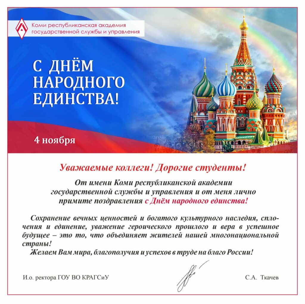 С Днем народного единства! Поздравление и.о. ректора Академии Сергея Алексеевича Ткачева.