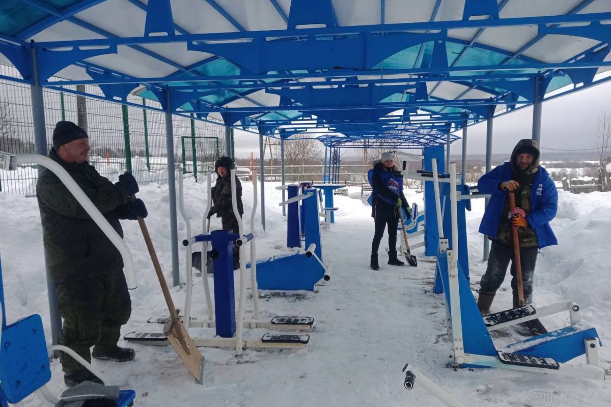 В Лэзыме партийцы очищают от снега спортобъекты