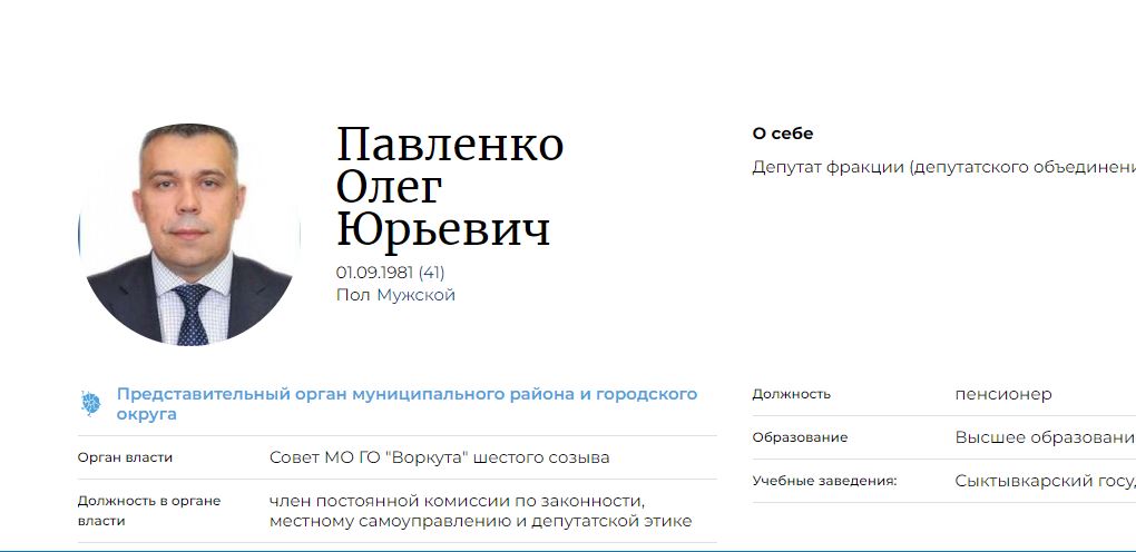 О.Павленко - депутат фракции "Единая Россия", член постоянной комиссии по законности, местному самоуправлению и депутатской этике. Закончил Сыктывкарский госуниверситет, на данный момент является пенсионером.