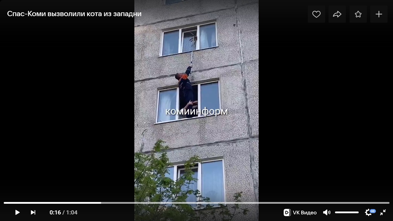 Сыктывкарский аварийно-спасательный отряд "Спас-Коми" Комитета ГО и ЧС вечером 17 мая выезжал на спасение кота.