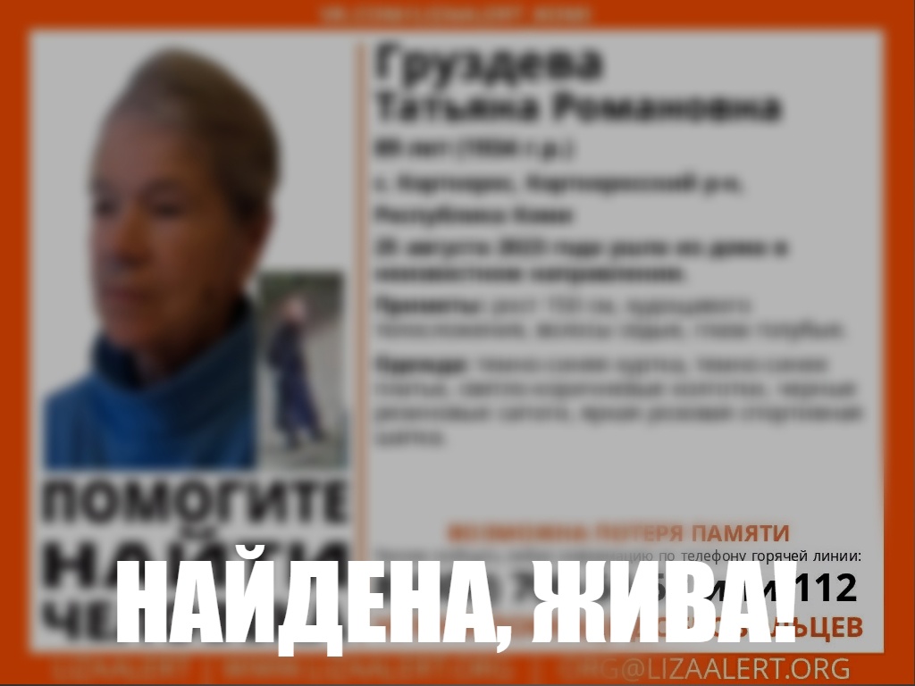 Вчера, 25 августа, 89-летняя Татьяна Груздева ушла из дома в селе Корткерос и пропала. Женщину видели в селе, но домой она к ночи не вернулась.