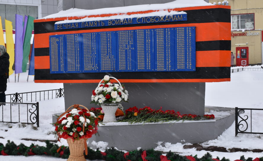 Сегодня утром состоялись церемонии возложения цветов к памятникам в сквере Мирный и к обелиску воинам-слобожанам на Слободской площади.