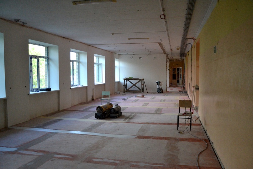 Работы на объекте начались в мае 2023 года. На сегодняшний день уже проделан большой объём работ. Сделан демонтаж старых конструкций, произведена грунтовка, оштукатуривание и шпаклёвка стен, обустроены полы, завершаются электромонтажные работы, идёт окраска стен. За счёт средств местного бюджета в школе также будет отремонтирована кровля. Кроме того, ремонт параллельно идёт на лестничных пролётах школы и на входной группе.