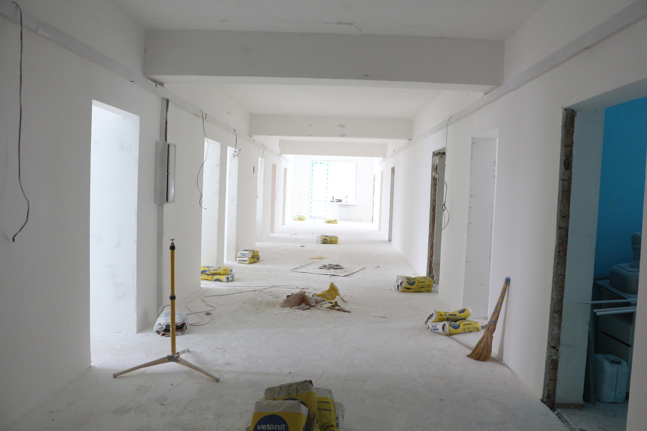 Ремонт выполнен на 70 процентов. Подрядчик заверяет, что справится к маю текущего года. На втором этаже осталось установить двери, которые поступят в эти выходные и постелить линолеум. Стены готовы под покраску.