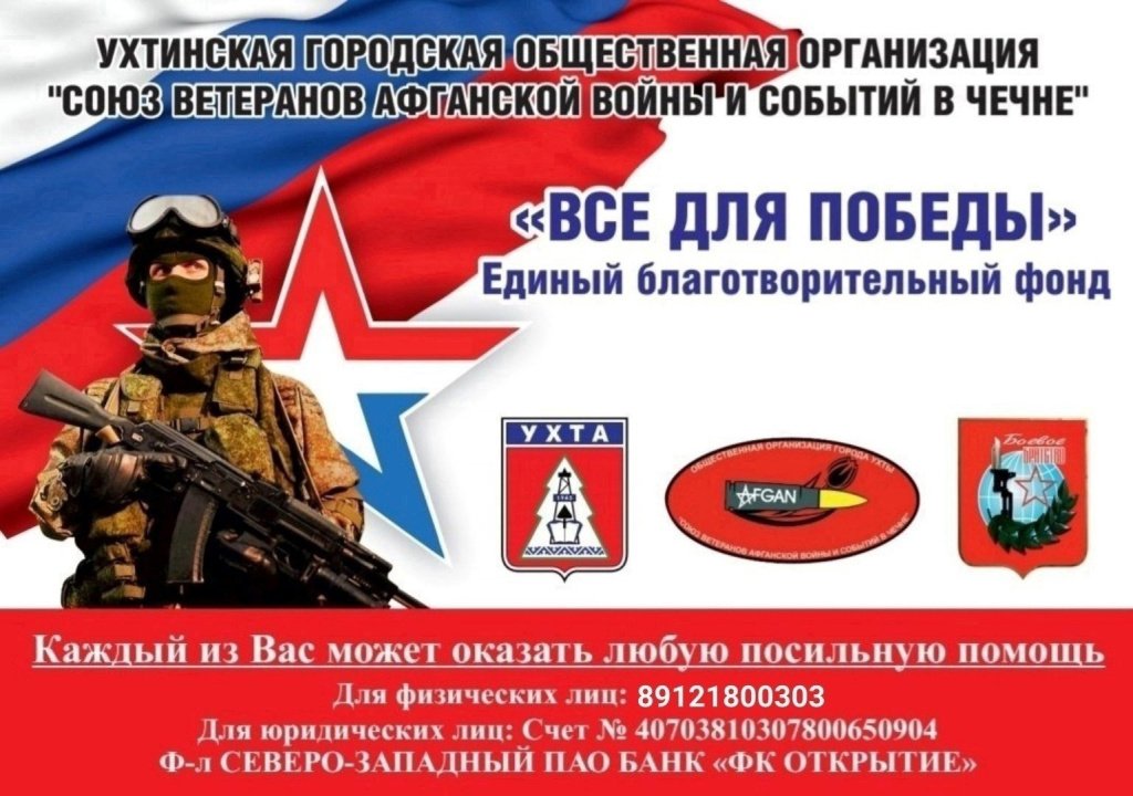 Напомним, единым сбором гуманитарной помощи в Ухте занимается Союз Афганской войны и событий в Чечне. Для этой цели организован благотворительный фонд «Всё для Победы». Реквизиты ниже.