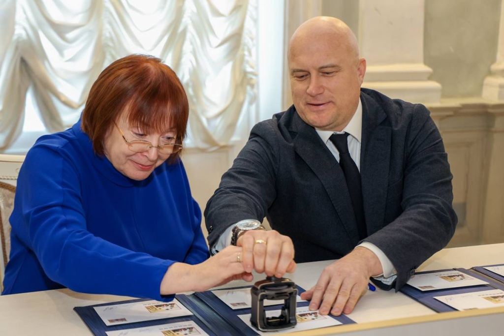 Первыми оттиск штемпеля на марку поставили директор макрорегиона Северо-Запад Почты России Александр Вакуленко и первый проректор СПбГУ Елена Чернова.