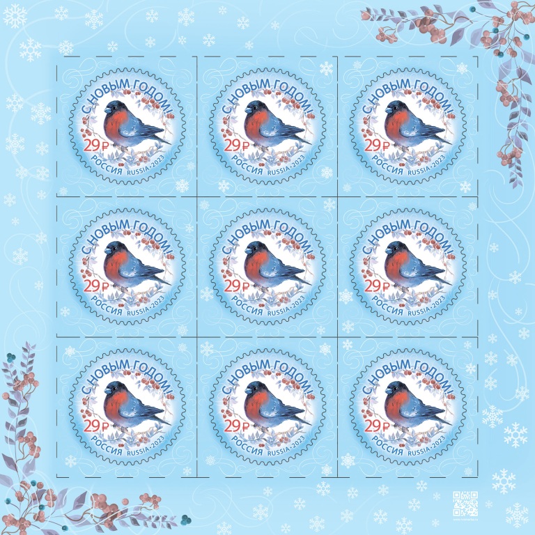 5 декабря в почтовое обращение вышла праздничная марка «С Новым Годом!». На ней на фоне снежных узоров изображён снегирь и веточки с ягодами рябины.
