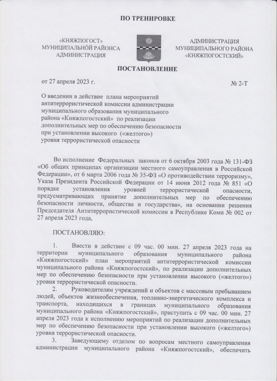 С 9 час. 00 мин. 27 апреля 2023 г. на основании Указа Президента Российской Федерации от 14 июня 2012 г. № 851 «О порядке установления уровней террористической опасности, предусматривающих принятие дополнительных мер по обеспечению безопасности личности, общества и государства» и в связи с поступлением требующей подтверждения информации о реальной возможности совершения террористического акта, решением №002 председателя антитеррористического комитета Республики Коми Уйба В.В. на территории Республики Коми установлен высокий («желтый») уровень террористической опасности.