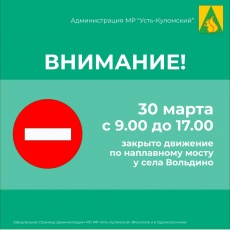 30 марта 2023 года с 9:00 до 17:00 будет закрыто движение для транспортных средств по наплавному мосту НМ-17 у с.Вольдино, в связи с техническими работами по ремонту.