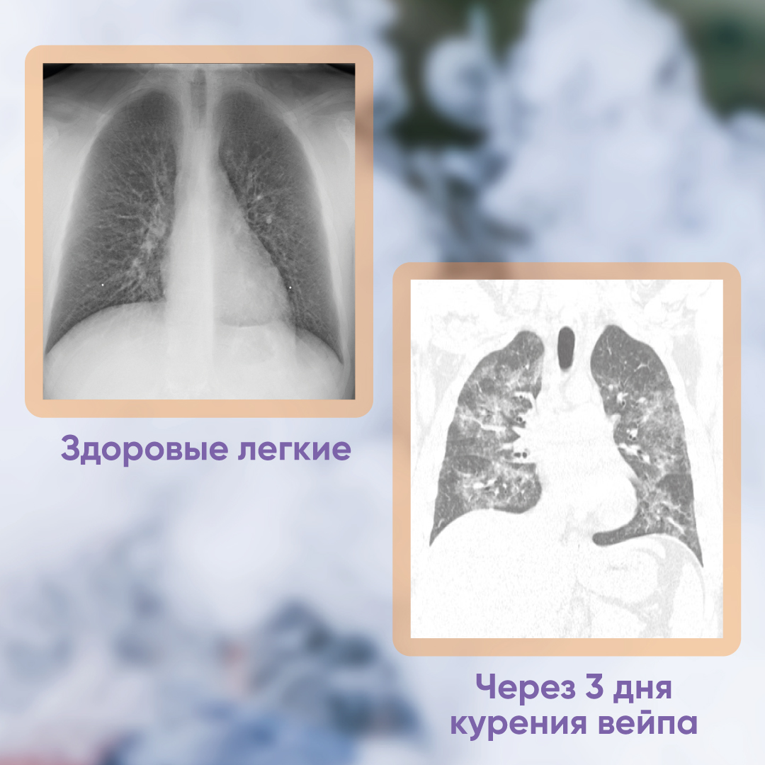 Не так давно научный журнал «Radiology» опубликовал результаты исследования снимков легких подростков, которые увлекались курительными гаджетами. Как показали рентгенологические исследования и компьютерной томографии грудной клетки пациентов, их органы были серьезно повреждены испарениями электронных сигарет, а в нижней части легких проявились характерные образования округлой формы, по своей структуре похожие на те, которые появляются при пневмонии. При этом оболочка легких деформирована, как будто бы она получила серьезный ушиб. Итоги исследования завершились следующим резюме: «Повреждения легких, связанные с употреблением электронных сигарет (EVALI), представляют собой серьезную проблему для общественного здравоохранения, значительно повышая показатели заболеваемости и смертности, особенно среди молодежи».