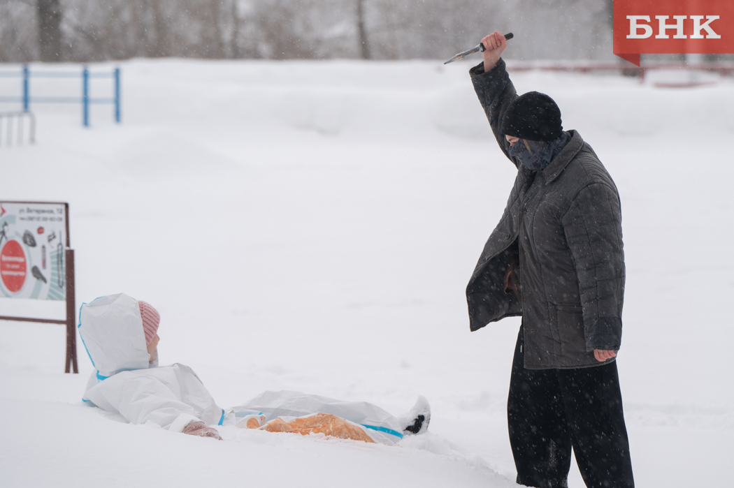 Имитировали происшествие сотрудники молодежного центра Сыктывкара (нападавшие) и студенты медицинского института СГУ (потерпевшие). Обе стороны постарались максимально вжиться в роль: использовались муляжи оружия, «жертв» щедро облили кровью-томатным соком, на молодых людей надели маски, имитирующие страшные раны, использовались специальные накладки-травмы.