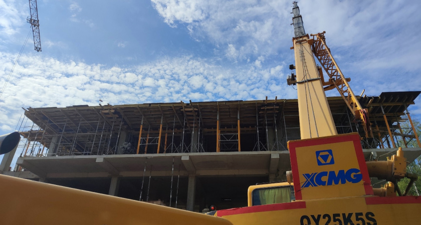 В настоящее время на четвертом этаже больницы устанавливают бетонные колонны. Больницу строит около 30 человек, задействовано 7 единиц техники.