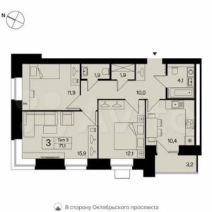 Классическая «трёшка» №84 свободной планировки с мастер-спальней. Есть лоджия с французским остеклением выхода, два раздельных с/у, места для систем хранения. Квартира светлая, окна с низкими подоконниками (60 см от пола). В одной из комнат — эффектное большое угловое окно. Вид в сторону Октябрьского пр-та. Энергоэффективное остекление Energy Light, профиль Deceuninck 71 мм. Высота потолков — 3,1 м.